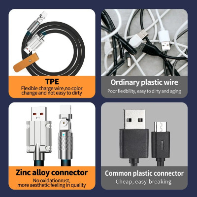 - تصميم دوار 180 درجة للألعاب: تصميم الكوع المبتكر يدور 180 درجة، مما يسمح لك بإمساك الهاتف بشكل مريح وطبيعي أثناء اللعب أو مشاهدة الفيديوهات دون أن يعيق الكابل يديك.